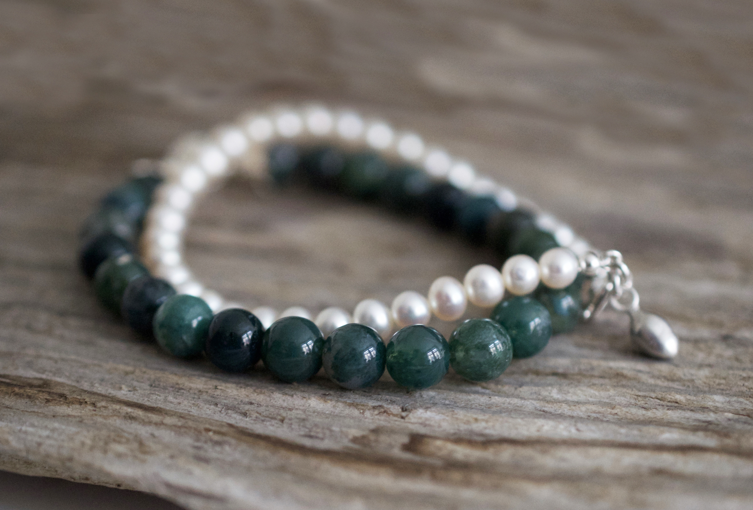 Moosachat ist ein Chalcedon mit eingelagerten Schlieren und moosähnlichen Zeichnungen aus grünen Magnesium-Eisen-Silikaten.
