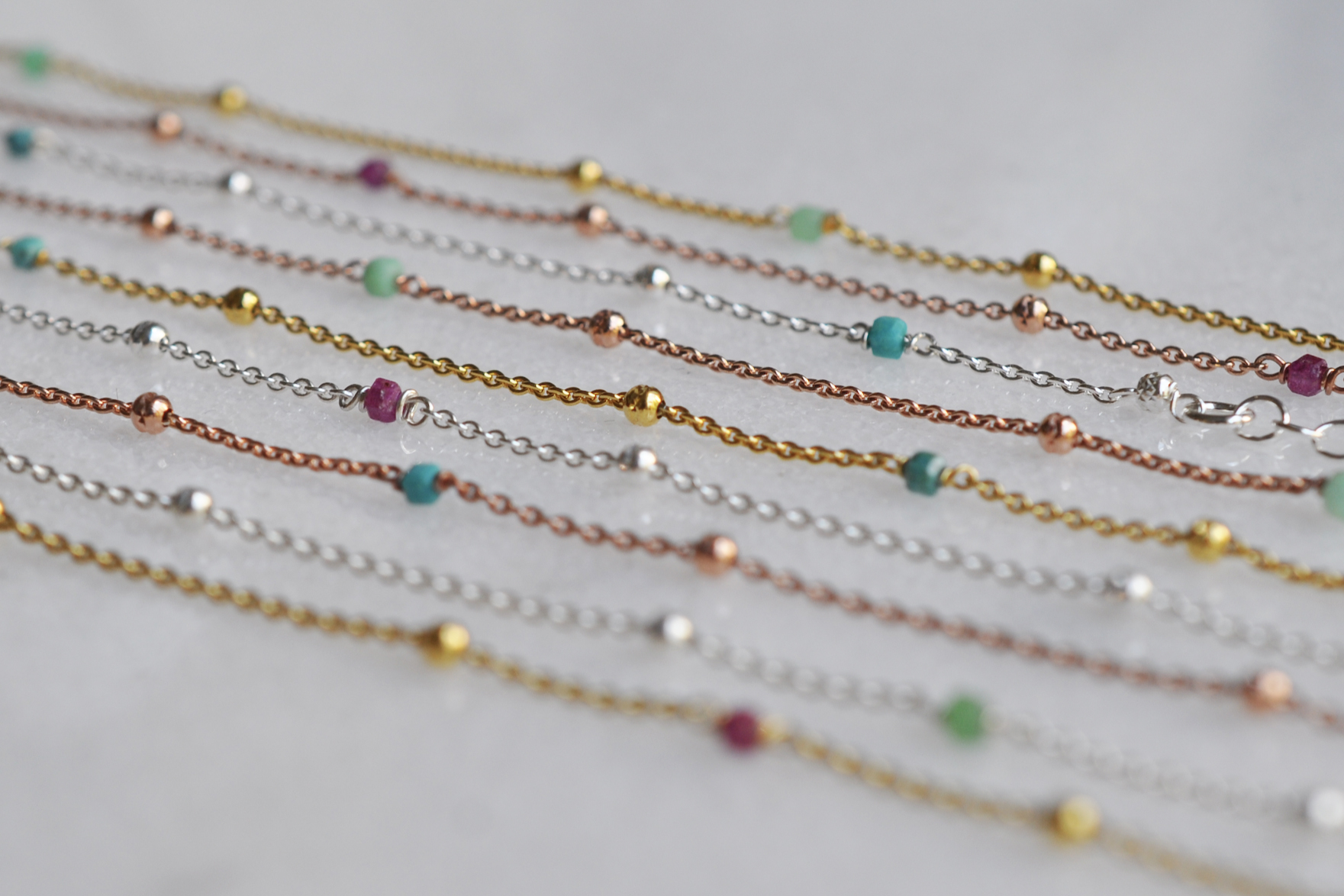 Kleinste Edelstein Würfelchen wechseln sich mit Silberpunkten ab, so dass die Fusskette minimalistisch und gleichzeitig verspielt wirkt. Türkis, Chrysopras und Rubin sind seltene Schätze der Erdkruste, die diese Fussketten umso schöner und wertvoller machen.