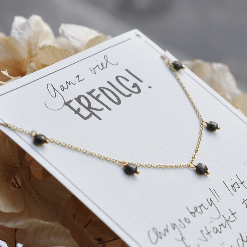 Halskette mit fünf Chrysoberyll Anhängern, ein seltenes Mineral für maximalen Erfolg.