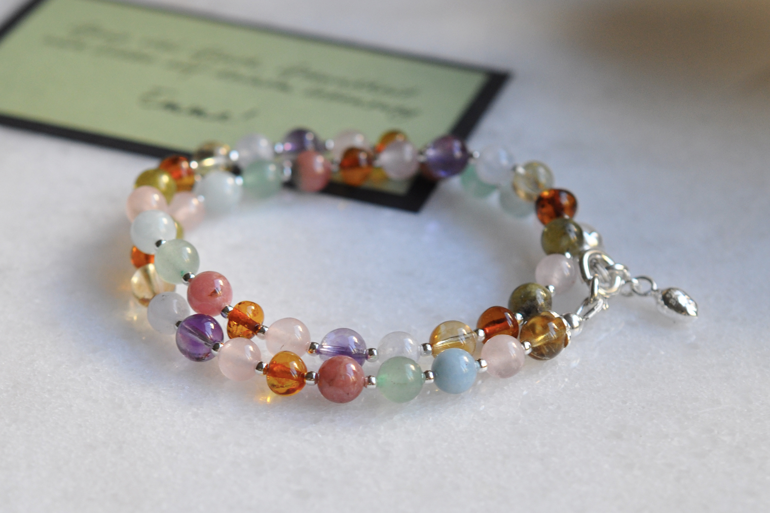 Der Durchmesser der Steine ist 6mm, dazwischen sitzen feine Silberkügelchen. Im Nacken (oder je nach Trageform vorne) ist eine BENEVOLENTI Eibenbeere befestigt. Die Länge variiert je nach Alter.