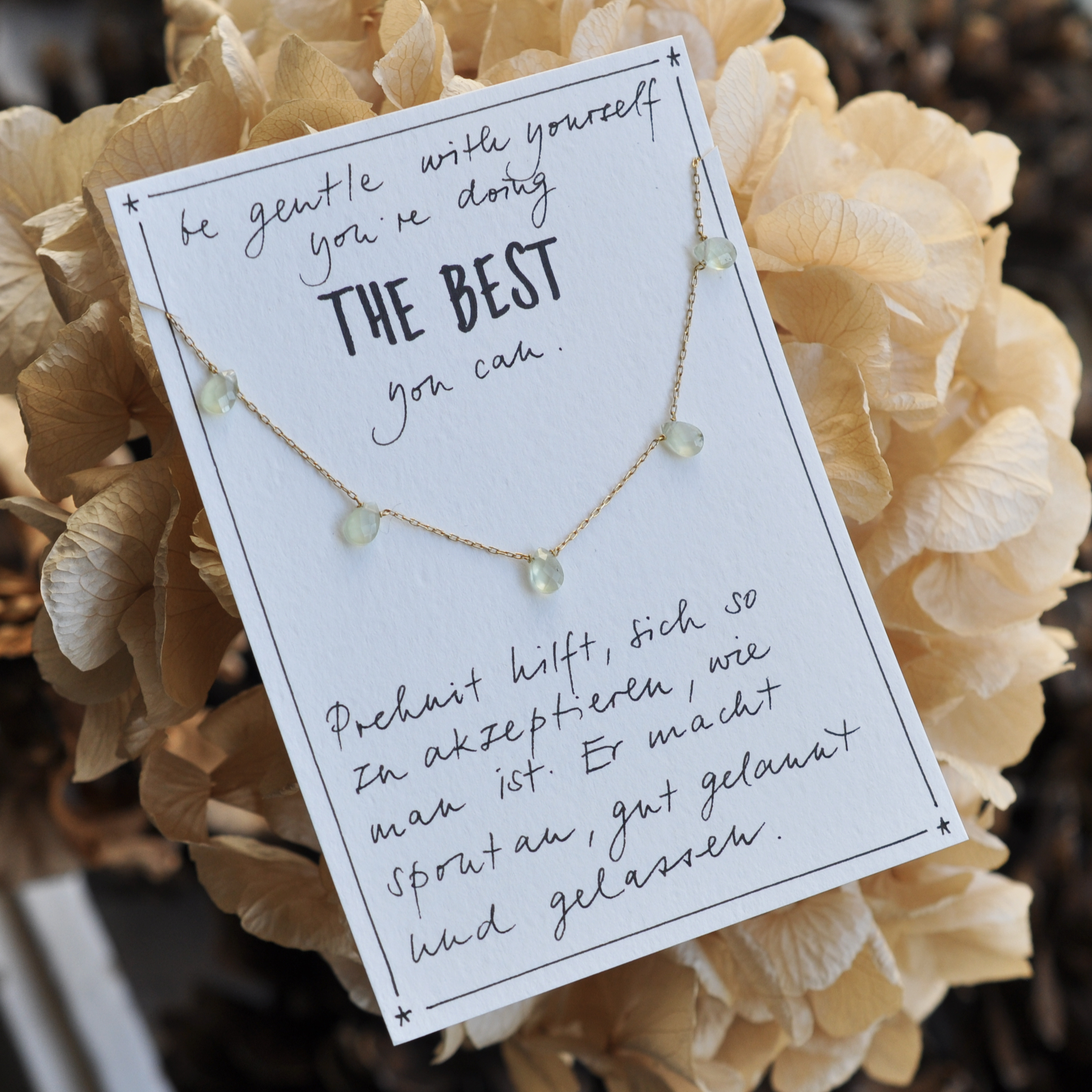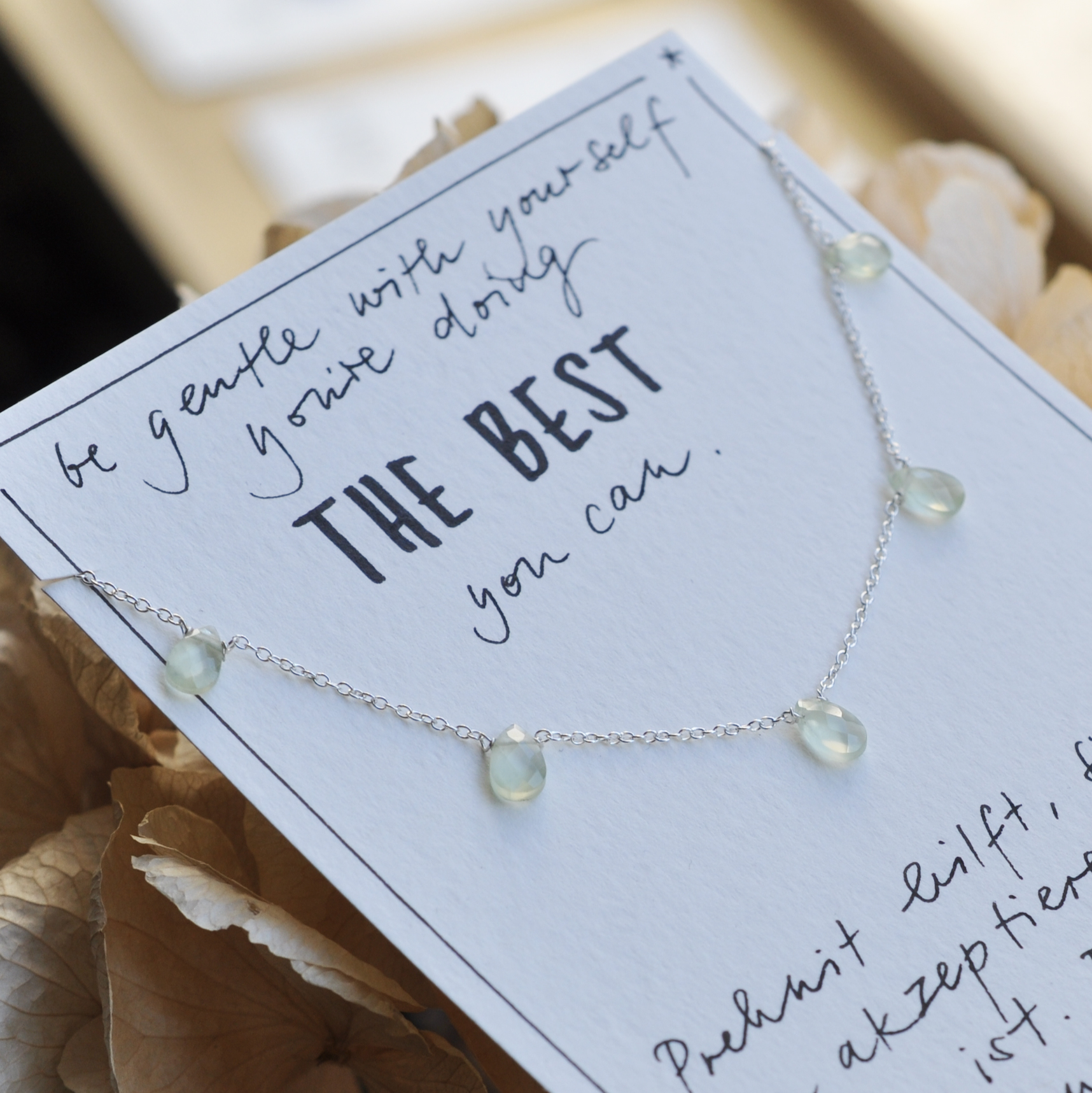 Lindengrüne Prehnite von mir auf eine filigrane Kette gesetzt – wunderbar leicht und doch stark.