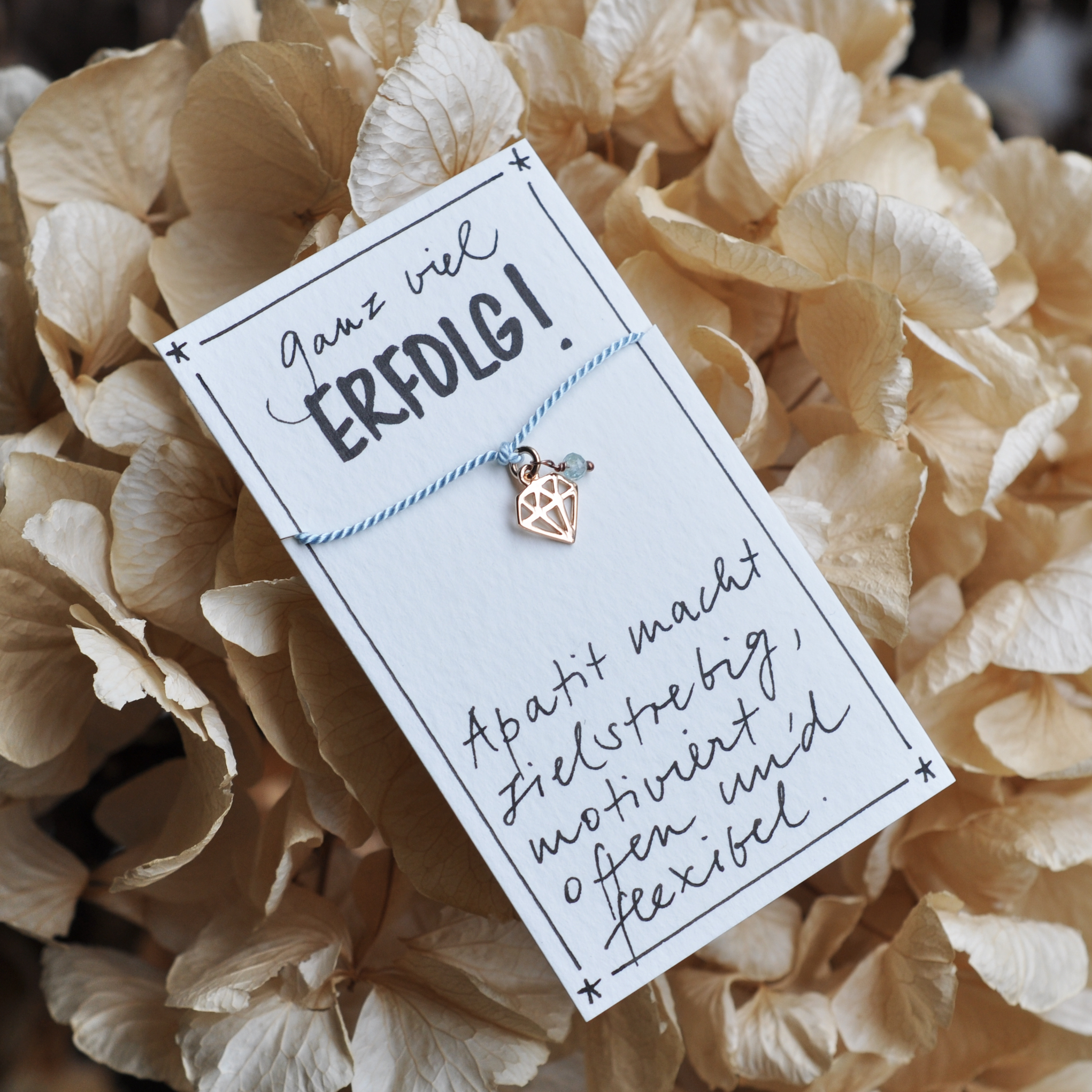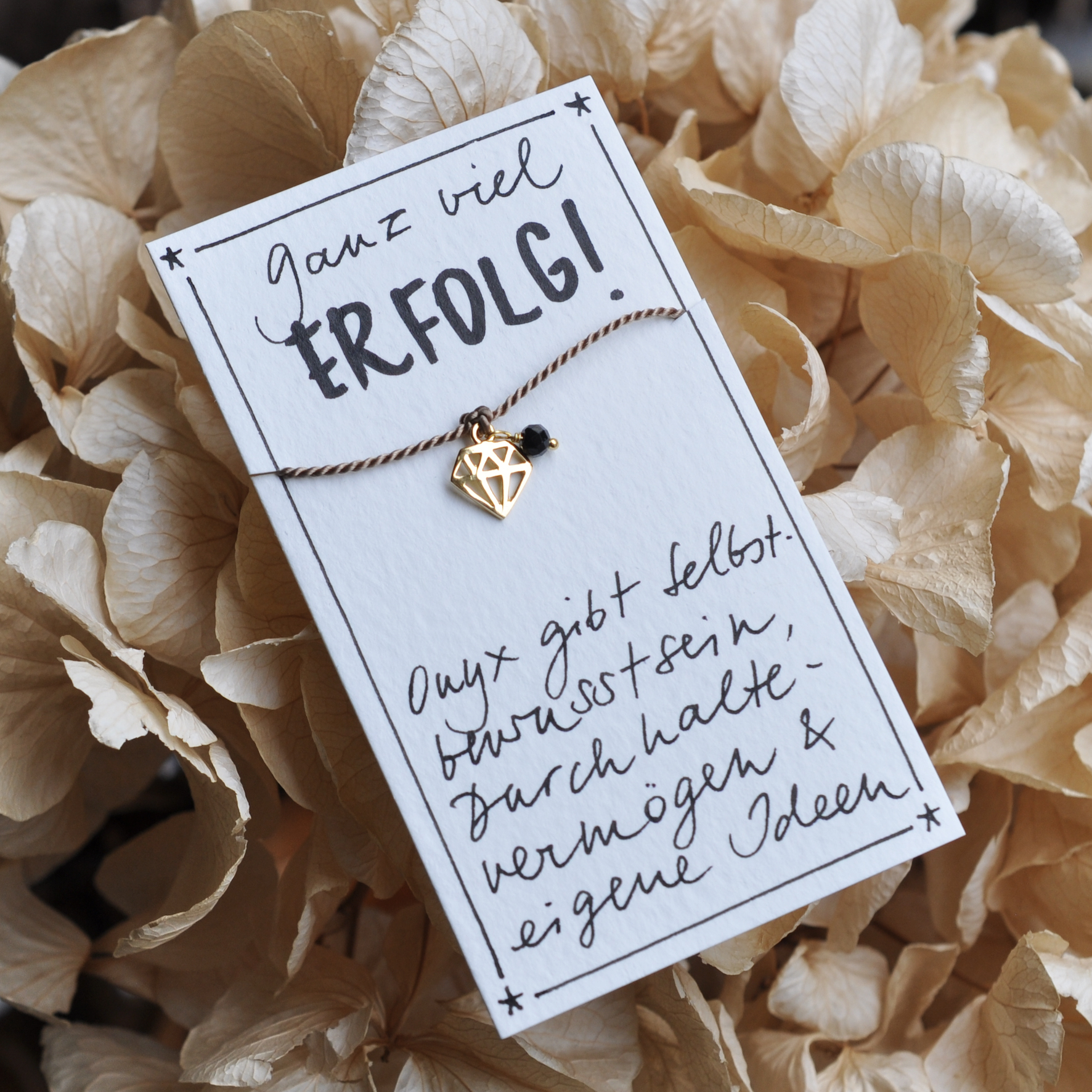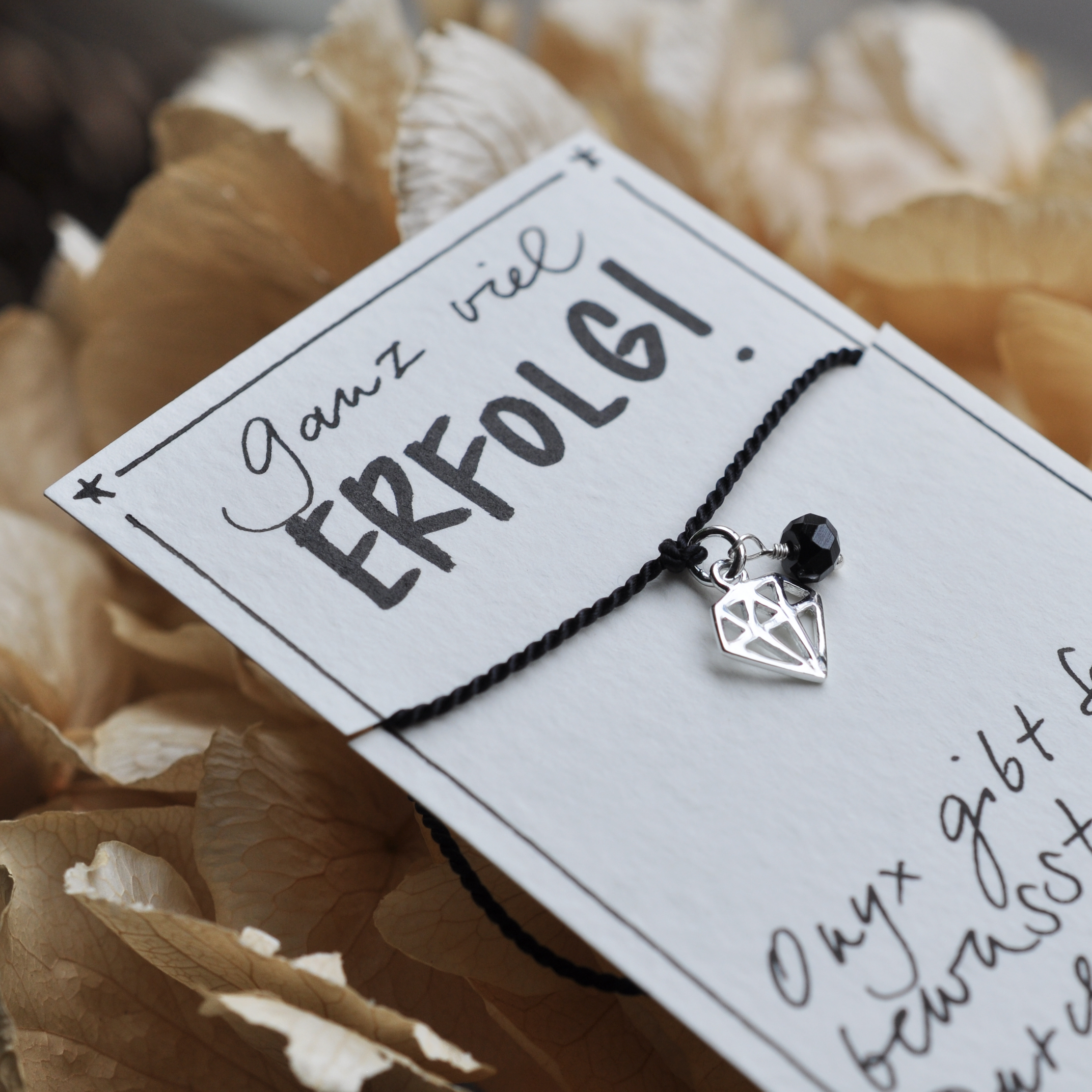 Wunscharmband mit Diamant: Onyx und Apatit sind Minerale des Erfolgs. Als Begleiter am Handgelenk unterstützen sie dich und deine Freunde bei allen Herausforderungen und Abenteuern. Auf einen grossen Erfolg und richtig viel Motivation!