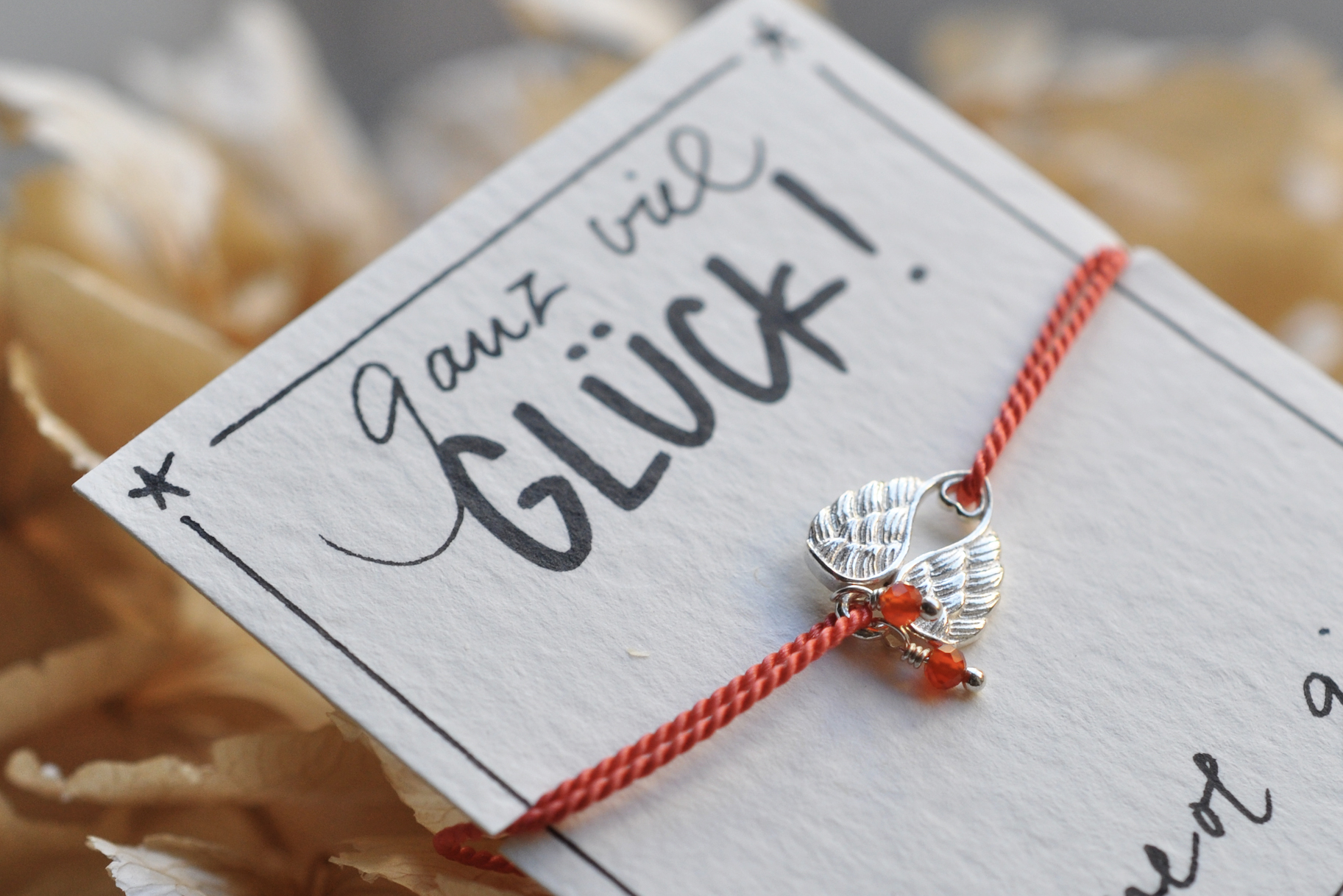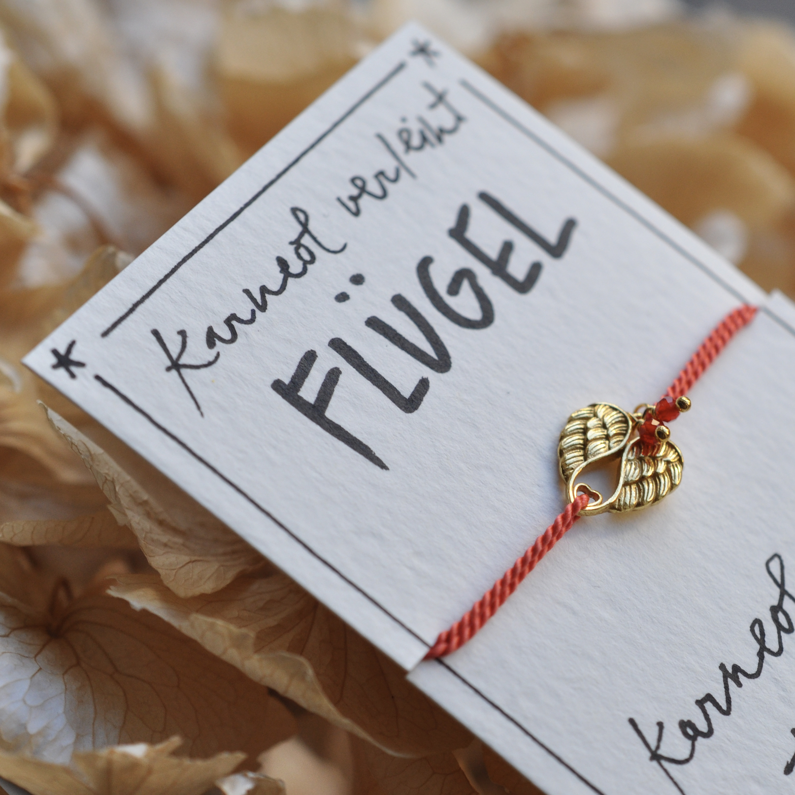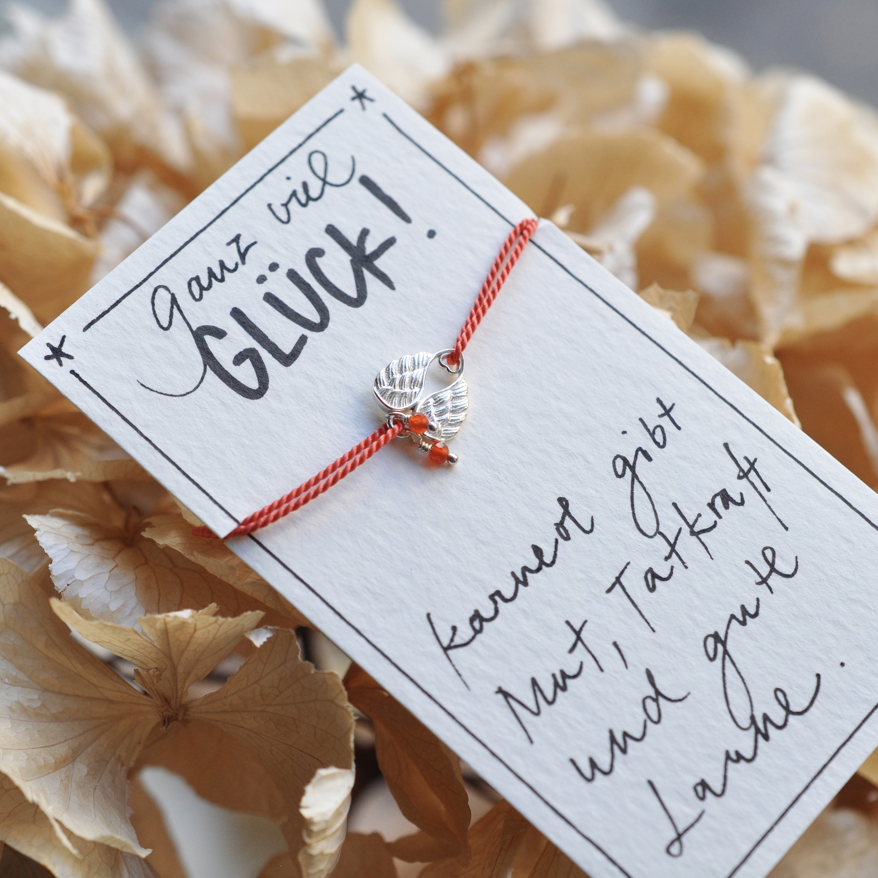 Klitzekleine glitzernde Karneole begleiten ein Flügelherz und stehen für Mut und gute Laune. Eine 100% Naturseide vervollständigt dieses feine aber starke Armband.
