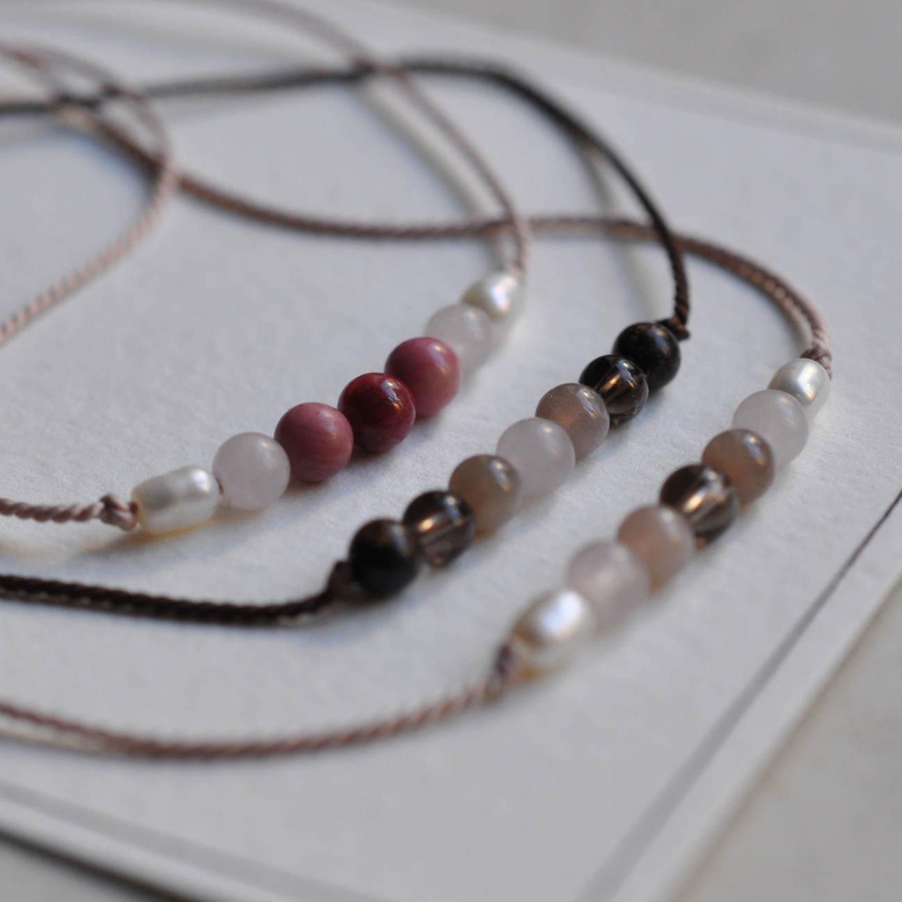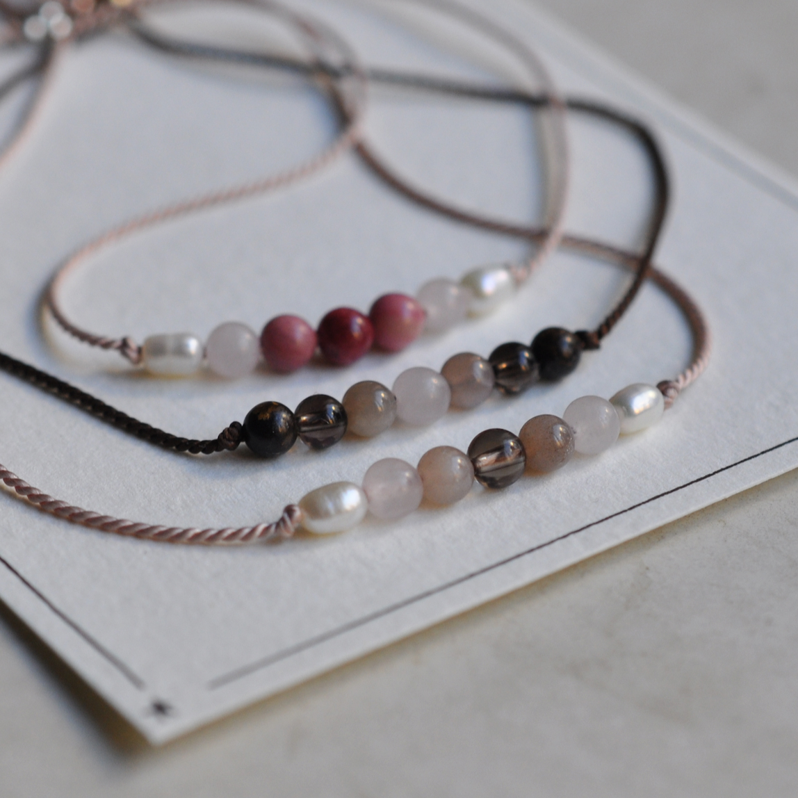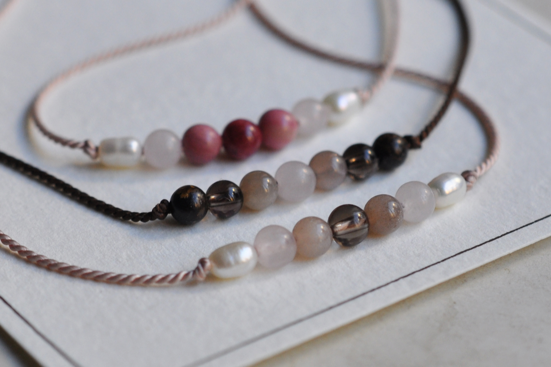 - Perlen, Rosenquarz, Mondstein, Rauchquarz